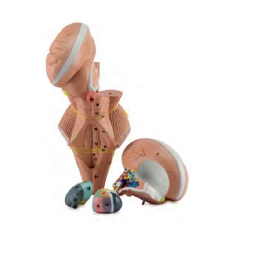 Brainstem & Hypothalamus Model 2X Enlarged 4 Parts 模型分為四個部分,放大至自然大小的兩倍,是人腦幹和下丘腦的詳細表示。腦幹被切割以顯示下丘腦核;丘腦可拆卸並可分為兩部分以便內部檢查。顱神經的插入點在腦幹表面上易於識別。附有與相關結構的資訊卡。重要的解剖結構被編號並用不同顏色標示,以便於理解。