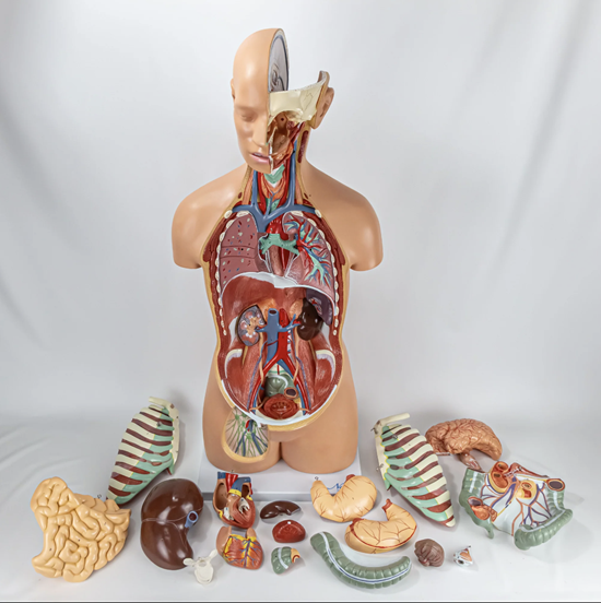 可拆卸部分:一半的大腦,沿縱軸切割以顯示內部結構和血管;眼睛及視神經和眼外肌;顯示支氣管樹和血管化的左右肺;降主動脈和食道;心臟分為兩部分,顯示心房、心室、心瓣膜,並切割心室心壁;一半的腎臟,沿前面切割以顯示內部結構和血管;腎臟、尿道和膀胱,附有前列腺(可拆卸為兩部分);胃,顯示肌肉和血管結構;胰腺、胃、十二指腸和脾臟,附有血管和管道;肝臟;小腸和大腸,帶有可拆卸的蓋子,覆蓋在盲腸部分;第12胸椎(T12)及脊髓。安裝在耐用的聚合物基座上。配有互動式3D解剖模型和增強現實,是鼓勵學習和支持的絕佳工具。