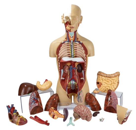 可拆卸的組件如下:一半的大腦,沿縱軸切割以暴露裂縫、內部結構和血管;眼睛及視神經和眼外肌;氣管;降主動脈和食道;左右肺(各2個部分),顯示支氣管樹和血管;肝臟及膽囊;一半的腎臟,沿前面切割以顯示內部結構和血管;心臟分為兩部分,顯示心房、心室、心瓣膜並切割心室心壁;胃;胰腺、胃、十二指腸和脾臟及其血管和管道;小腸和大腸,並在盲腸區域有可拆卸的窗口;在胯部區域的可拆卸蓋。隨著增強現實的互動3D解剖模型,是鼓勵學習和支持的絕佳工具。