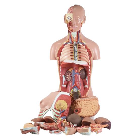 可拆卸的男性和女性泌尿生殖系統是可互換的。可拆卸的結構包括:眼睛及視神經和眼外肌;腦的一半,沿著縱向軸分開,顯示內部結構和血管;氣管;降主動脈和食道;左右肺(各2件),顯示支氣管樹和血管化;肝臟及膽囊;腎臟的一半,沿著前面平面切割,顯示內部結構和血管;心臟分為2部分,清楚描述心房、心室、瓣膜和心壁截面;胃解剖成2部分;胰腺、胃、十二指腸和脾臟及其血管和管道;小腸和大腸,帶有可拆卸的蓋子,覆蓋在盲腸部分;男性和女性泌尿生殖系統(各4部分),切割以提供內部元素的優秀視圖;胸椎(T12)及脊髓;女性胸壁;配合互動3D解剖模型和增強現實是一個很好的工具,以促進學習和支持。