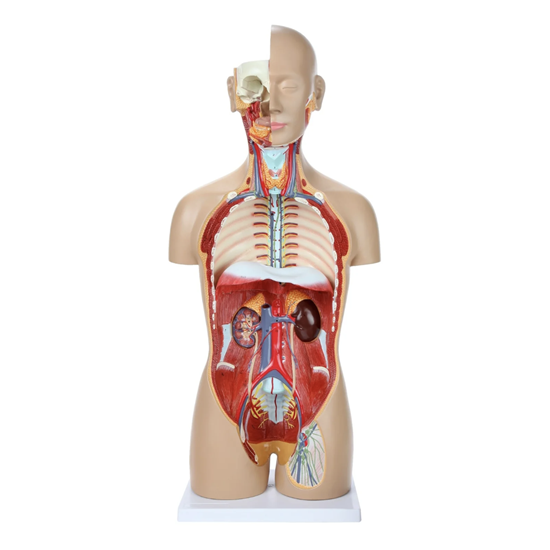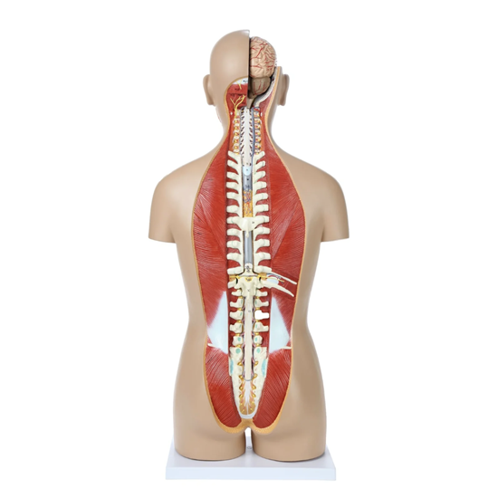 全尺寸,背部開放,由27個部分組成,提供真實的再現和詳細的解剖結構。所有身體系統均有代表,並且完全可接觸。重要結構編號並在說明手冊中參考。這個模型是任何生物學或解剖學課程的寶貴補充。開放的背部暴露了肌肉層以及脊柱和相關的神經分支。一個胸椎,包括一段脊髓,可以拆卸以分析其解剖細節。頭部是開放的,腦部在一側完全暴露,頸部被解剖以暴露肌肉、神經、血管和腺體結構。