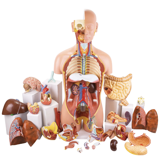 可拆卸的男性和女性泌尿生殖系統是可互換的。可拆卸的結構包括:眼睛及視神經和眼外肌;腦的一半,沿著縱軸分開,顯示內部結構和血管;氣管;降主動脈和食道;左右肺(各2件),顯示支氣管樹和血管化;肝臟及膽囊;一半的腎臟沿著前面平面切割,顯示內部結構和血管;心臟分為2部分,清楚描述心房、心室、瓣膜和心壁截面;胃解剖成2部分;胰臟、胃、十二指腸和脾臟及血管和管道;小腸和大腸,帶有可拆卸的蓋子,覆蓋在盲腸部分;男性和女性泌尿生殖系統(各4部分),切割以提供內部元素的優秀視圖;胸椎(T12)及脊髓。配合互動3D解剖模型和增強現實是一個很好的工具,以鼓勵學習和支持。