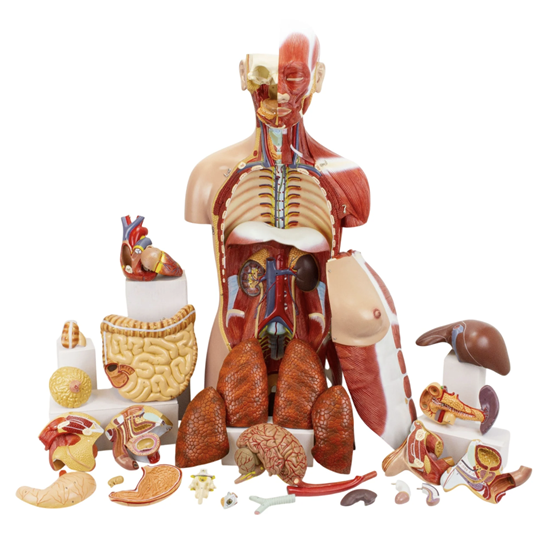 可拆卸結構:眼睛及視神經和眼外肌;腦的一半,沿著縱向裂隙分開,顯示內部結構和血管;氣管;降主動脈和食道;右肺和左肺(各2件),顯示支氣管樹和血管化;胸部和腹部覆蓋,顯示淺層肌肉;乳腺;肝臟及膽囊;一半的腎臟沿著前面平面切割,顯示內部結構和血管;心臟分為2部分,清晰顯示心房、心室、瓣膜和心壁截面;胃被解剖成2部分;胰腺、胃、十二指腸和脾臟及其血管和管道;小腸和大腸,帶有可拆卸的蓋子覆蓋盲腸部分;男性泌尿生殖系統(4部分);女性泌尿生殖系統(3部分),包括胚胎;胸椎(T12)及脊髓;配合一個互動的3D解剖模型和增強現實是一個很好的工具來鼓勵學習和支持。這個平台允許學生進行解剖模型的比較分析,因為他們比較和對比各個器官的結構。