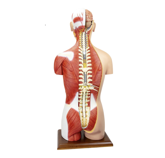 實物大小,身體系統被表示並且易於接觸。左側展示了淺層和深層肌肉以及血管和骨骼。打開的背部顯示了肌肉層以及脊柱和相關的神經分支。一個胸椎,包括一段脊髓,可以拆卸以分析其解剖細節。頭部是開放的,腦部在一側完全暴露。頸部被解剖以暴露肌肉、神經、血管和腺體結構。男性和女性的泌尿生殖系統是可拆卸和可互換的。