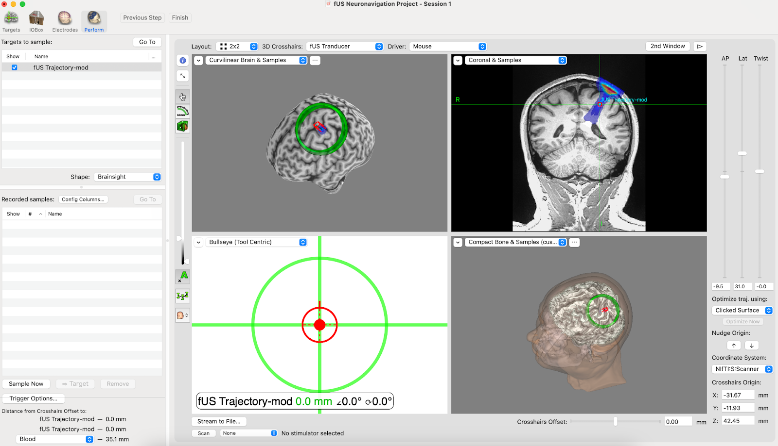 在經顱聚焦超音波(tFUS)中,神經導航追蹤通常至關重要,用以確認焦區是否確實位於預定腦靶點。BrainSonix 裝置已驗證可與磁性或光學追蹤系統相容。目前已有整合方案可與 Localite、BrainSight 及 Visor 2 神經導航系統搭配使用。