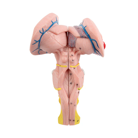 此為等比例實體模型,分為三部分,小腦與腦幹呈縱剖面,展示顱神經的起始位置及內部構造。所有結構均有標示並列於說明手冊中。重要解剖結構以編號及不同顏色標示,便於理解。採用耐用合成材料製成。附帶的擴增實境互動三維解剖模型,是促進學習與輔助教學的絕佳工具。此平台讓學生能進行解剖模型的比較分析,對比各器官的結構差異。此計畫亦提供持續教育平台,為所有學生提供增進解剖學、生理學及病理生理學知識的機會。