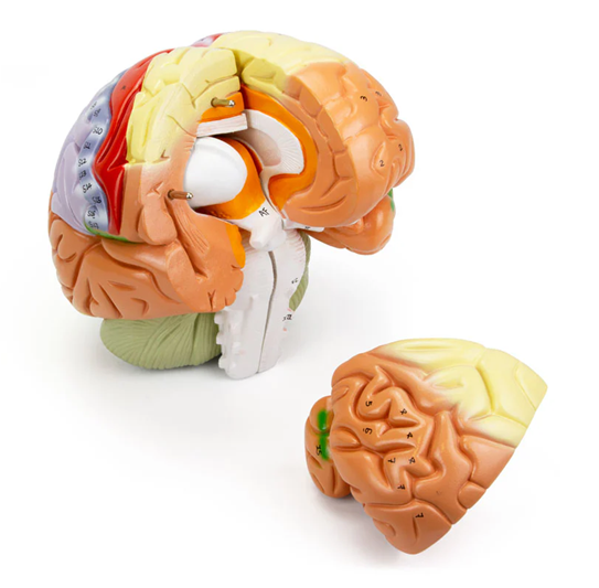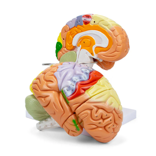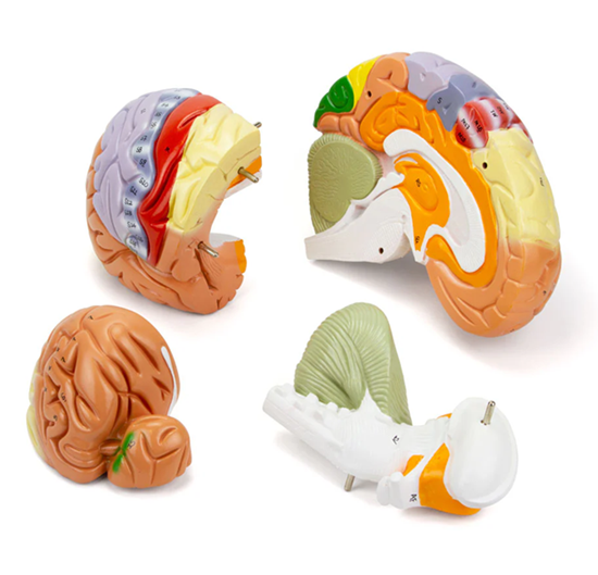 這款精心彩繪的放大大腦模型可分為左右兩半球。左半球可再細分為四部分,分別是頂葉、顳葉與枕葉,以及腦幹的一半和小腦的一半。右半球以彩色顯示大腦區域,左半球則以彩色標示功能區域。搭配擴增實境的互動式三維解剖模型,是促進學習與輔助教學的絕佳工具。此平台讓學生能進行解剖模型的比較分析,對比各器官的結構差異。此計畫同時提供持續教育的平台,為所有學生提供機會,增進對解剖學、生理學及病理生理學的認識。