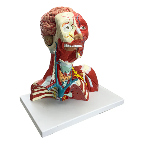 人體頭部肌肉模型,包含頸部、上胸部及帶有動脈的腦部,實物大小,可拆分為兩部分。神經、血管、骨骼、腺體及肌肉結構皆呈現細緻清晰。搭配具擴增實境功能的互動式三維解剖模型,是促進學習與輔助教學的絕佳工具。此平台讓學生能進行解剖模型的比較分析,對比各器官的結構差異。此計畫亦提供持續教育的平台,讓所有學生有機會增進解剖學、生理學及病理生理學的知識。